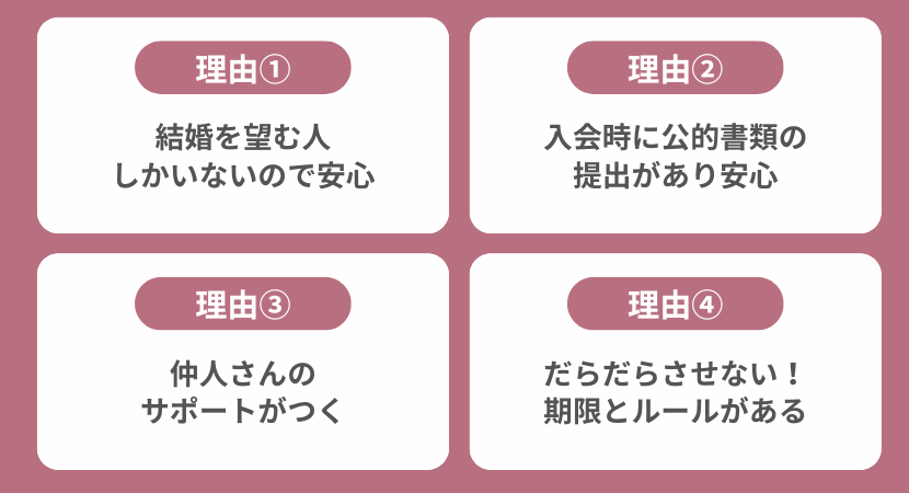 「結婚」という最終的なゴールに向けて効率よく自分の希望条件と合う人と会えるのが特徴です。