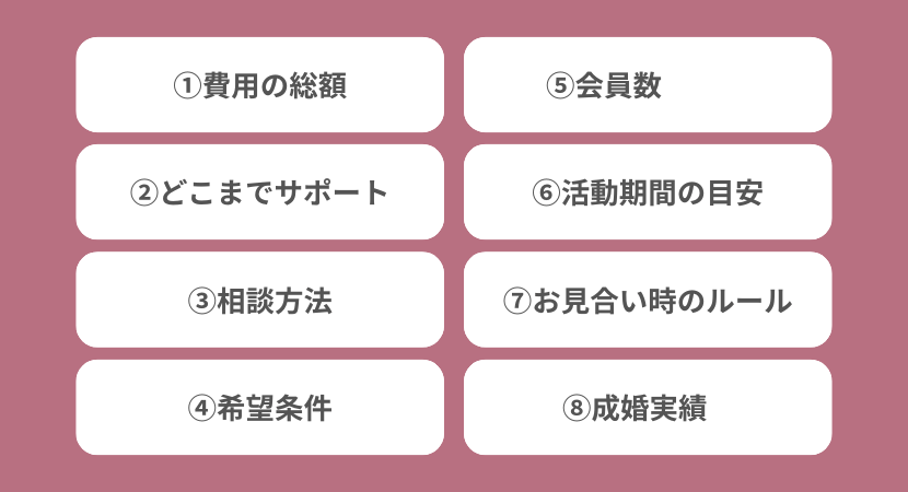 私が結婚相談所を選ぶときの経験からも、無料相談で確認しておいたほうがいいと思ってポイントがいくつかあります。